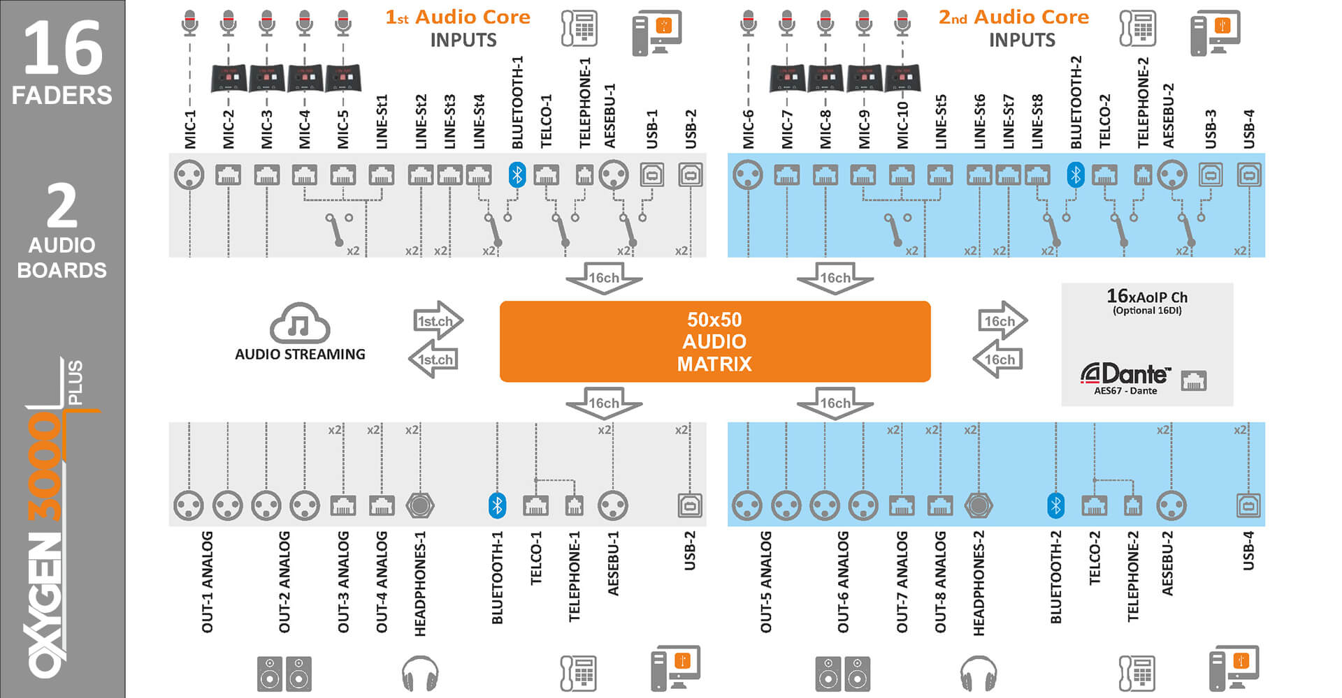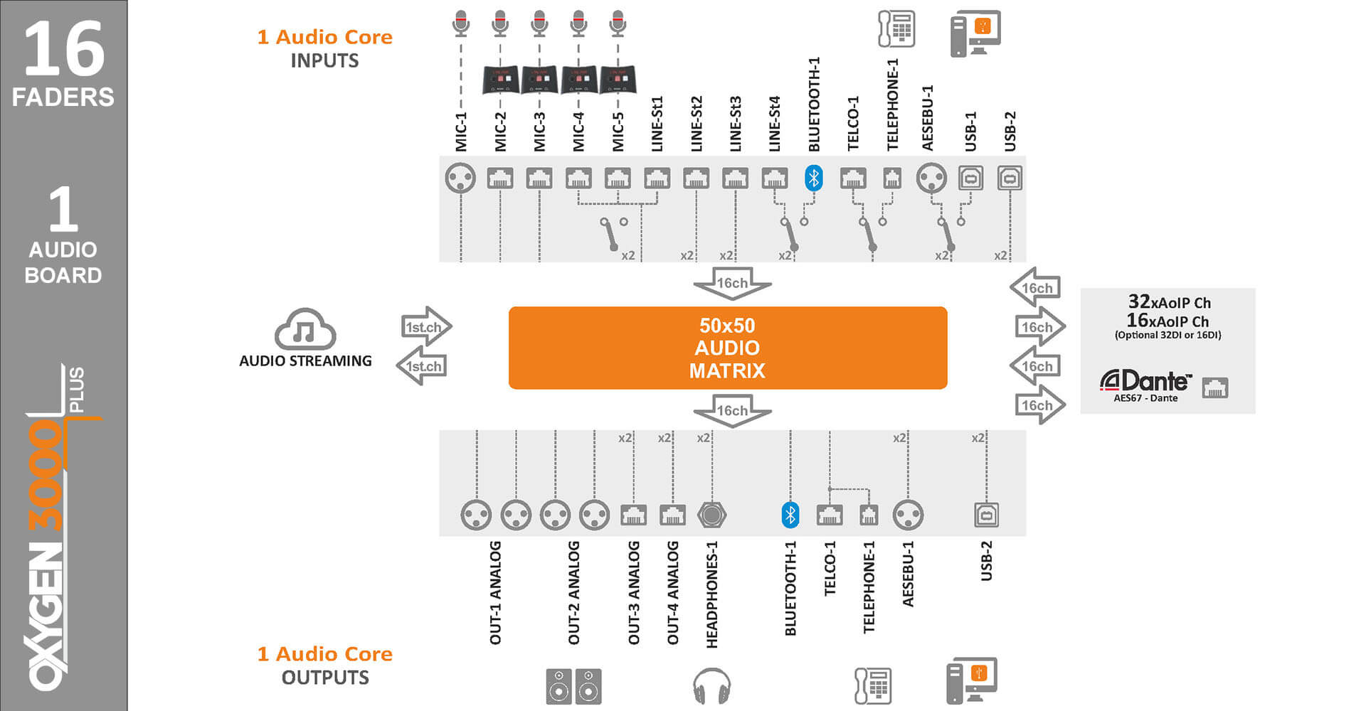 Available in 8, 12, or 16-fader configurations, Oxygen 3000 Plus combines powerful DSP-based audio processing, intuitive surface control, and comprehensive analogue, digital, USB, Bluetooth, streaming, Telco, and optional Dante™ AoIP connectivity. Advanced features such as user presets, snapshots, Smart Keys, HDMI monitoring output, and remote web-based control make it one of the most fully equipped broadcast consoles in its class.